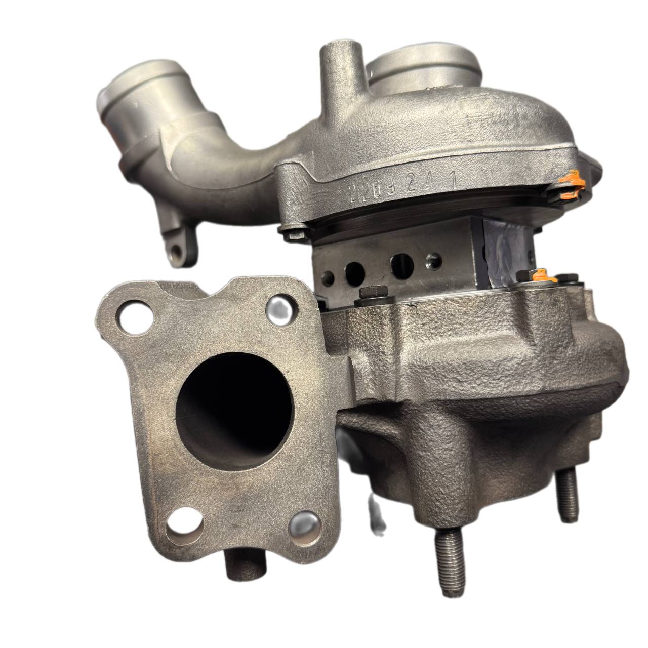 8. Установите турбонагнетатель на выпускной коллектор, убедитесь, что прокладка правильно прижата. Соединение выводов подачи/отвода масла и системы охлаждения турбонагнетателя может потребовать изменения их ориентации, для чего нужно отпустить прижимные планки на улитках. Впоследствии убедитесь, что все крепления затянуты и вал турбонагнетателя вращается свободно.